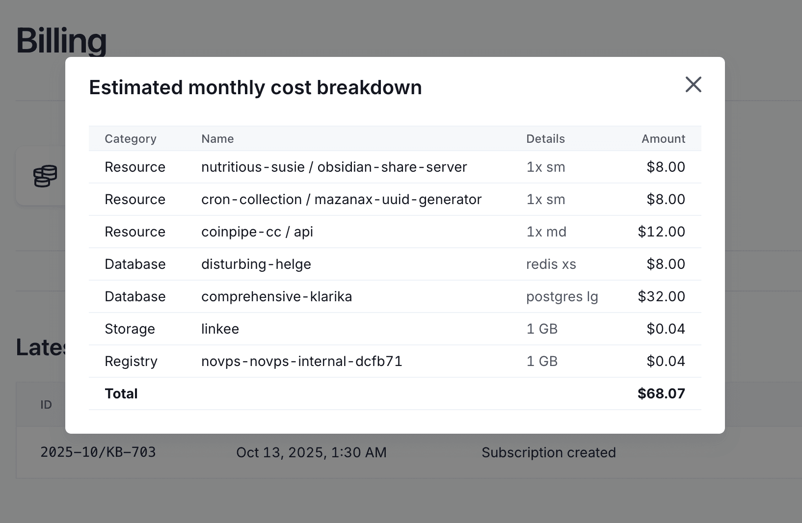 The Billing section now shows estimated costs for running resources, databases, and storage usage. This makes it easier to keep track of your infrastructure spend and understand exactly what you're paying for.